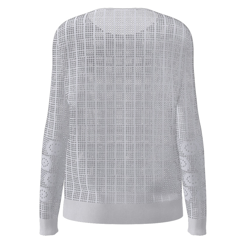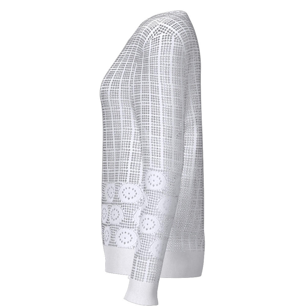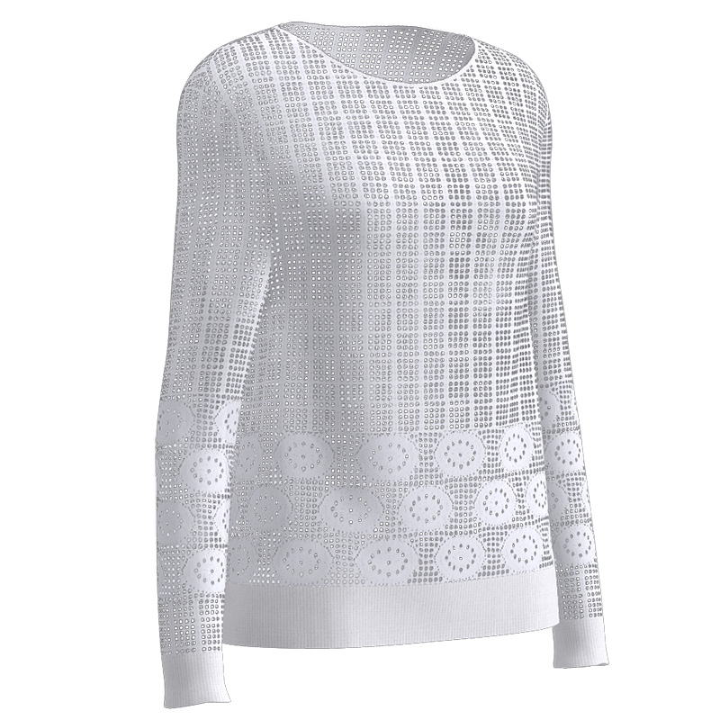 Our women's long-sleeve round neck sweater, designed for spring and summer, is crafted from 75% viscose and 25% nylon, featuring a mesh knit construction with circular jacquard patterns on the lower half. Here are the advantages highlighted: