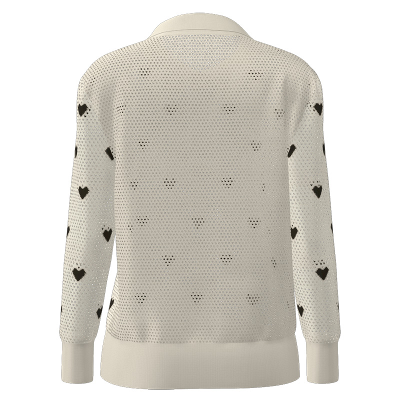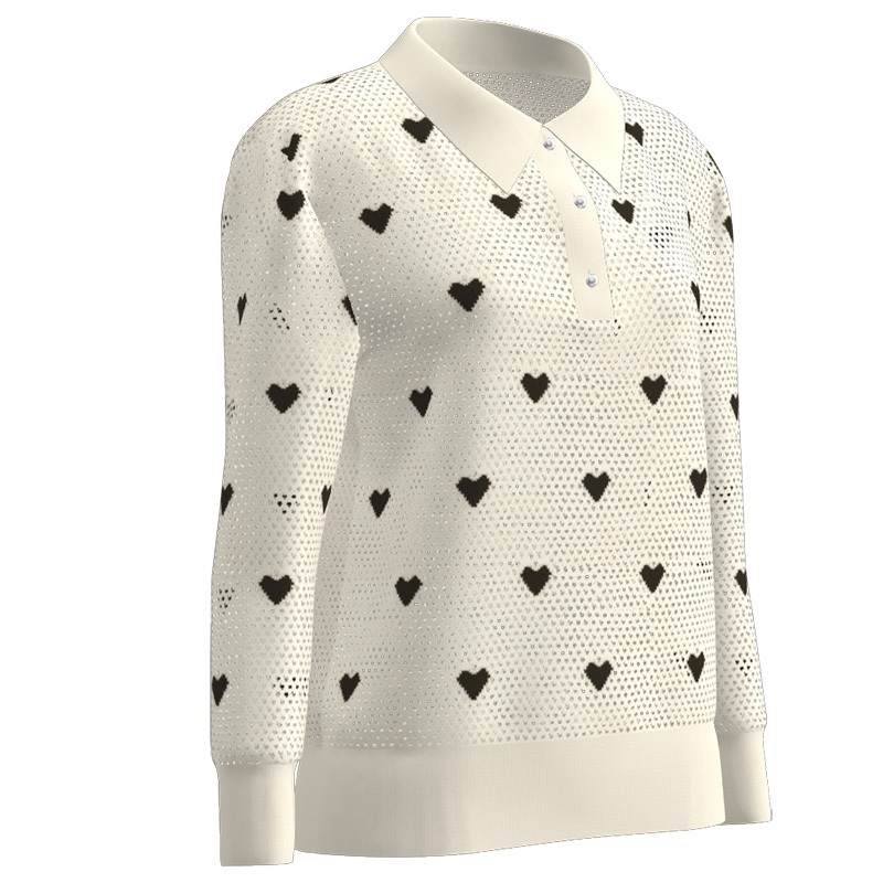 Women's long-sleeve wool polo shirt, made from 100% wool with mesh knit and adorned with an all-over heart pattern, boasts several advantages: